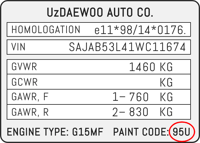 Finding your Daewoo colour code is easy. This one can be found on the lower right corner of the label after the words “Paint Code”.