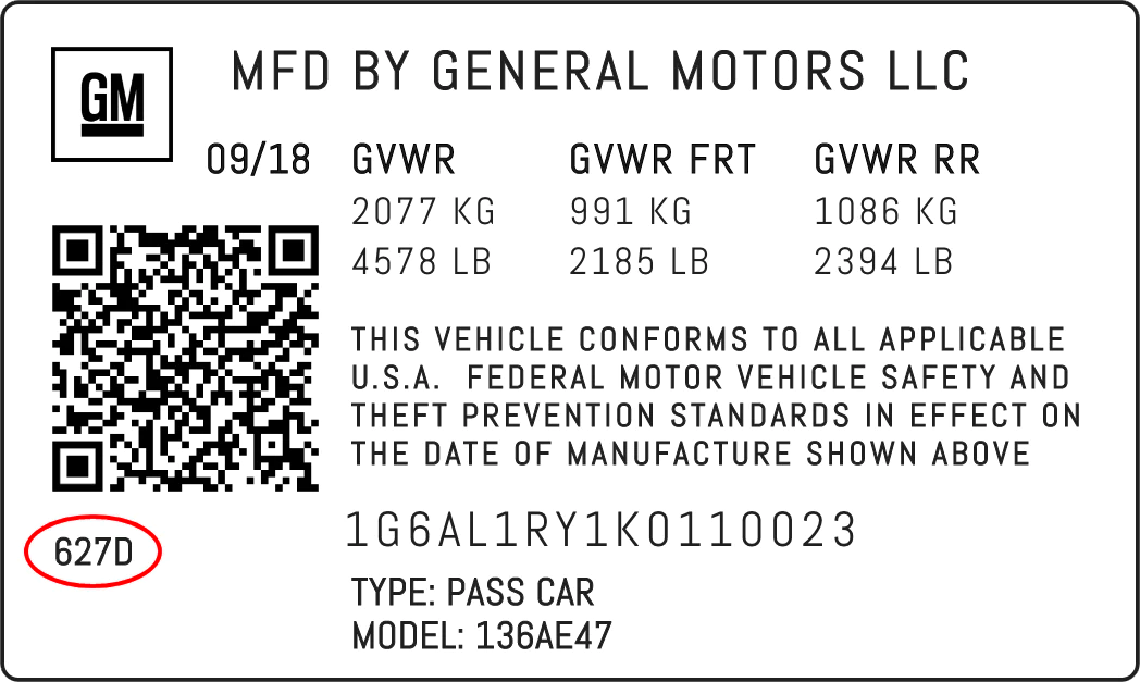 In most General Motors vehicles, the location of the paint code can vary. You might find it in the glove box, passenger sun visor, console, under the driver's seat, door jamb, spare tire cover/wheel well, or even under the trunk carpet. Consult your owner’s manual or your local dealer with your Vehicle Identification Number (VIN).