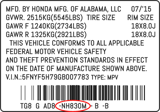 As shown in the label, your Honda colour code is a six character code and this is a combination of numbers and letters, usually beginning with NH and ending with M. The code is normally located at the far right hand side of the label or central bottom.