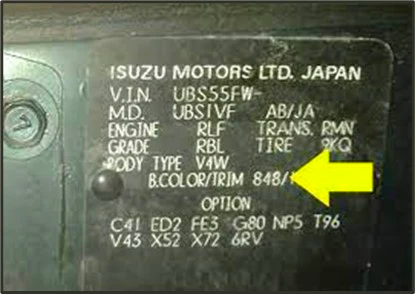 To find your Isuzu colour paint code, check out the label for the code referred to as “B.COLOR/TRIM” and the following three numbers.