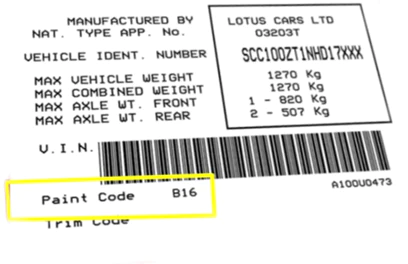 Finding your Lotus colour paint code is very simple. It can be found at the lower left corner of the label and it is usually three characters code after the words “Paint Code”.