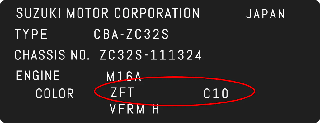 If you cannot find the Suzuki paint code / colour name on the car, you can call your local dealer with your Vehicle Identification Number (VIN), which you will find on the car or your log book / vehicle registration document, and they will be able to look it up on their internal database.